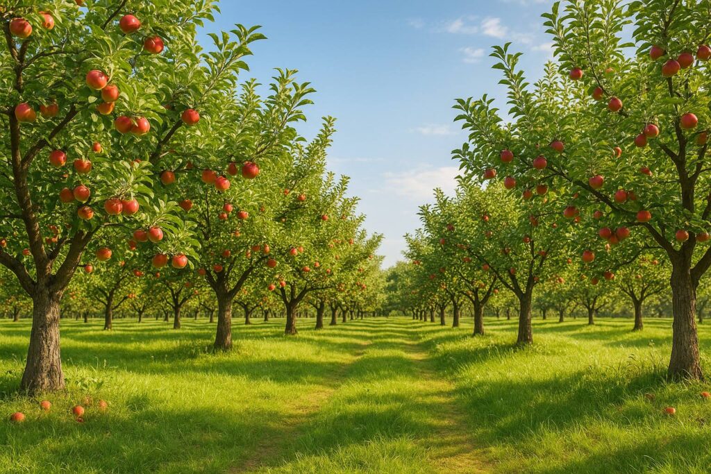 Widok na rzędy jabłoni w rodzinnym Sadzie Marynino – tutaj każda pora roku ma swój urok, od wiosennego kwitnienia po jesienny czas zbiorów.